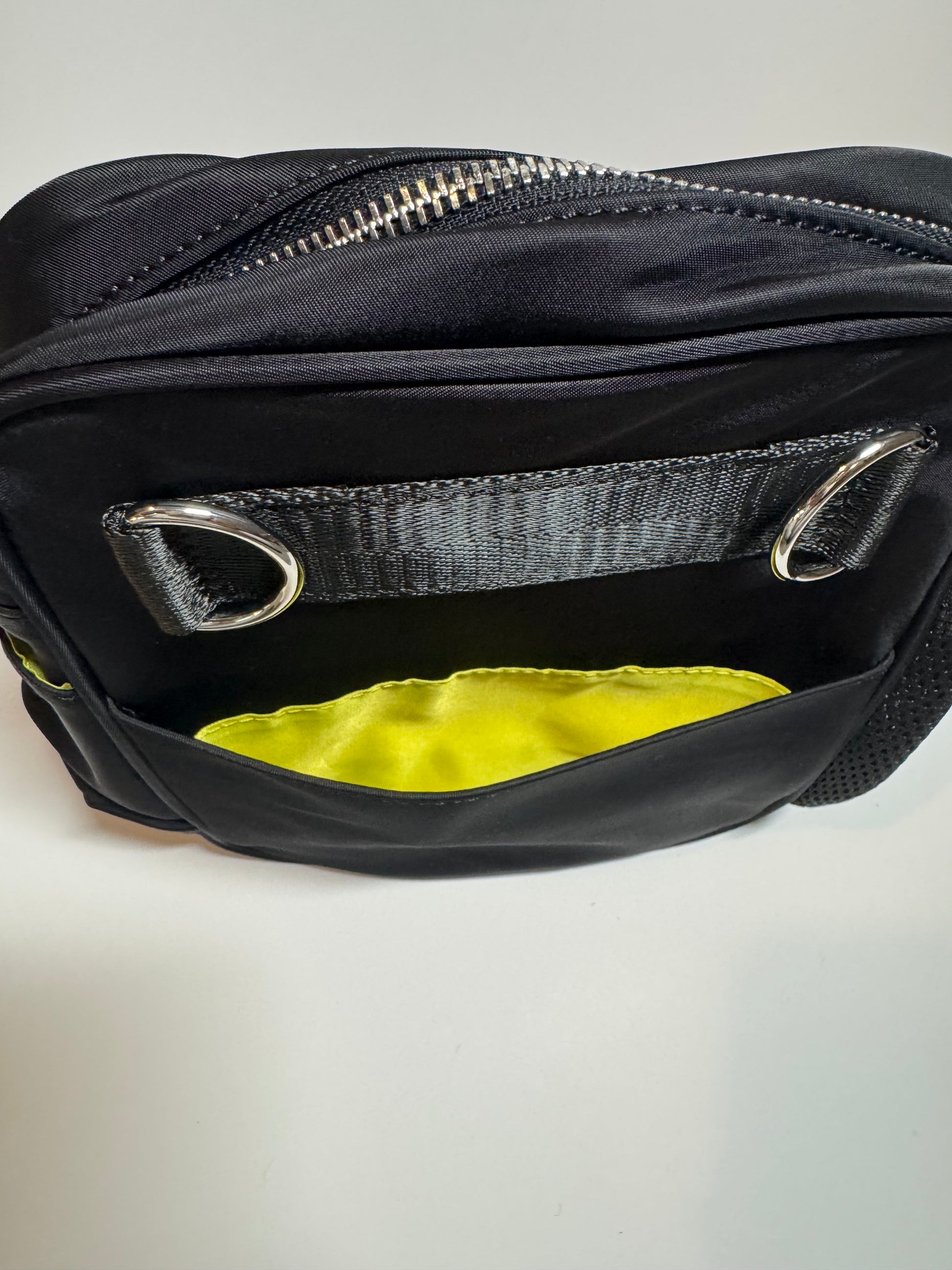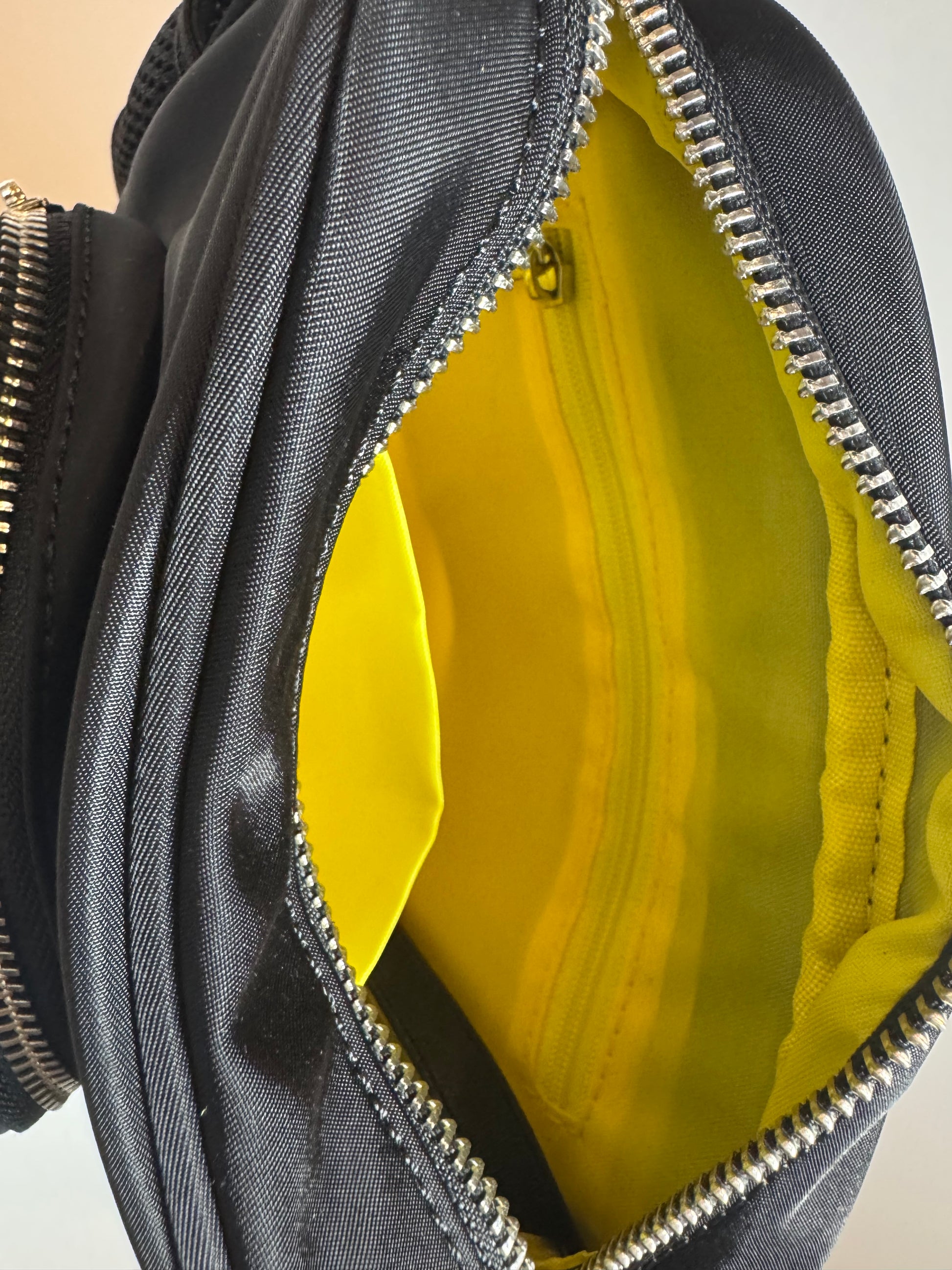 Materials: Outer fabric 290T Nylon (black), Inner lining 210D polyester(neon yellow), Zinc Hardware silver.