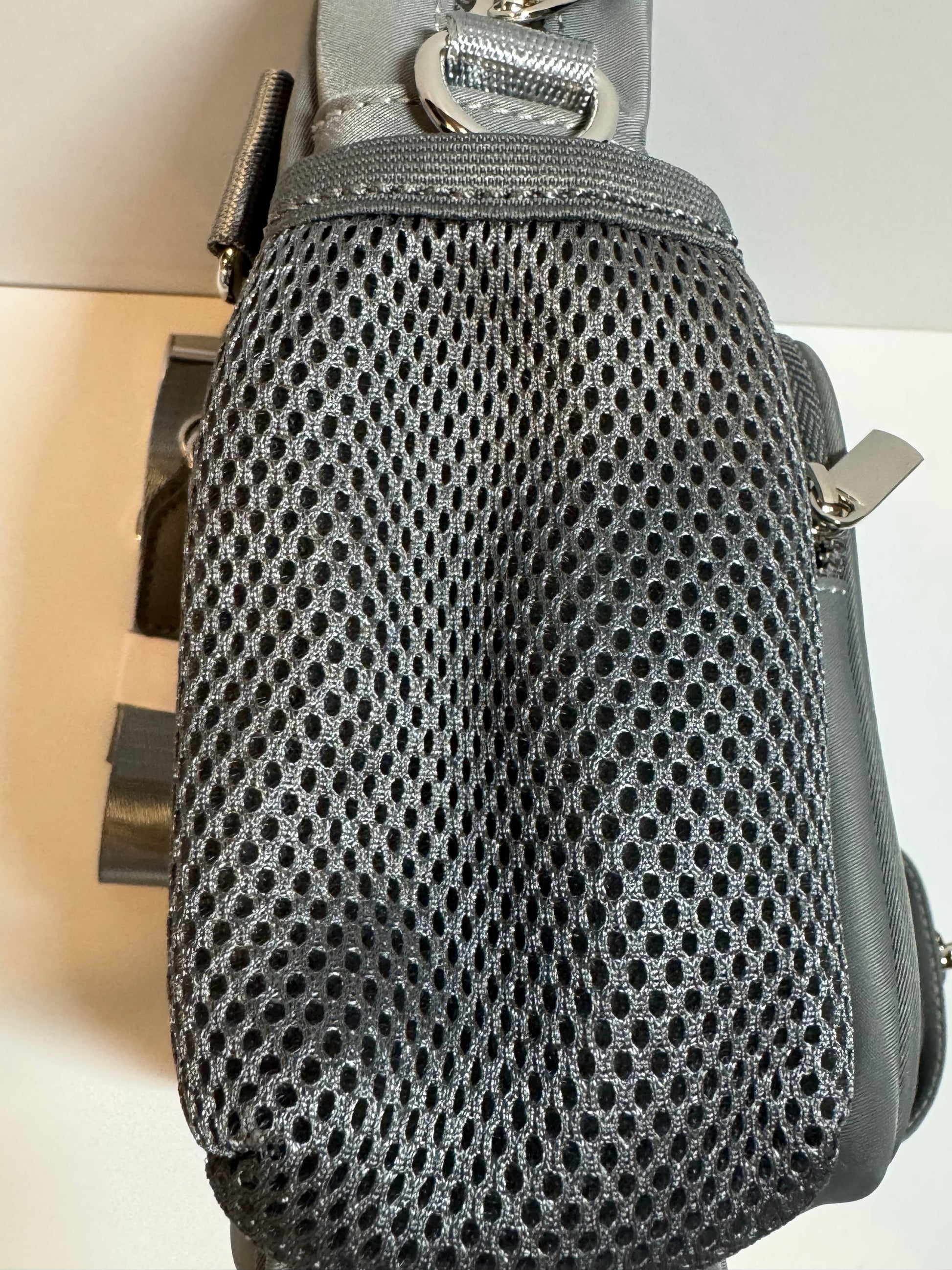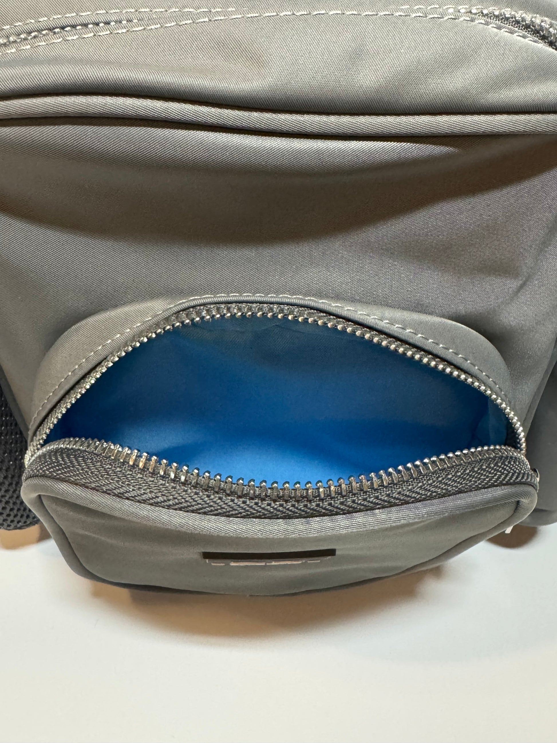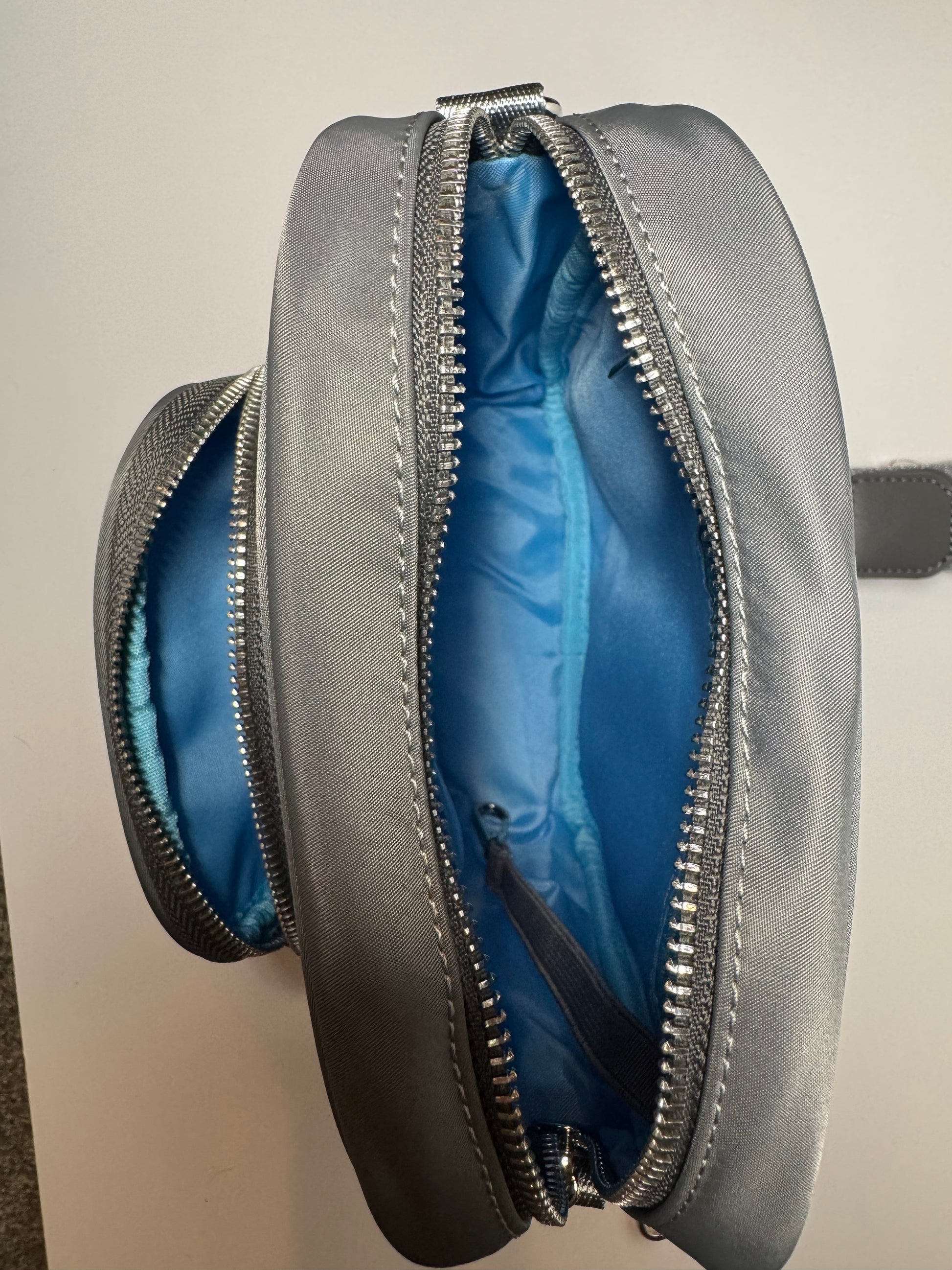 Materials: Outer fabric 290T Nylon (grey), Inner lining 210D polyester(bright blue), Zinc Hardware silver.
